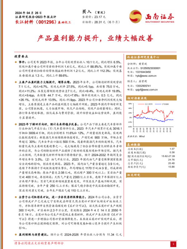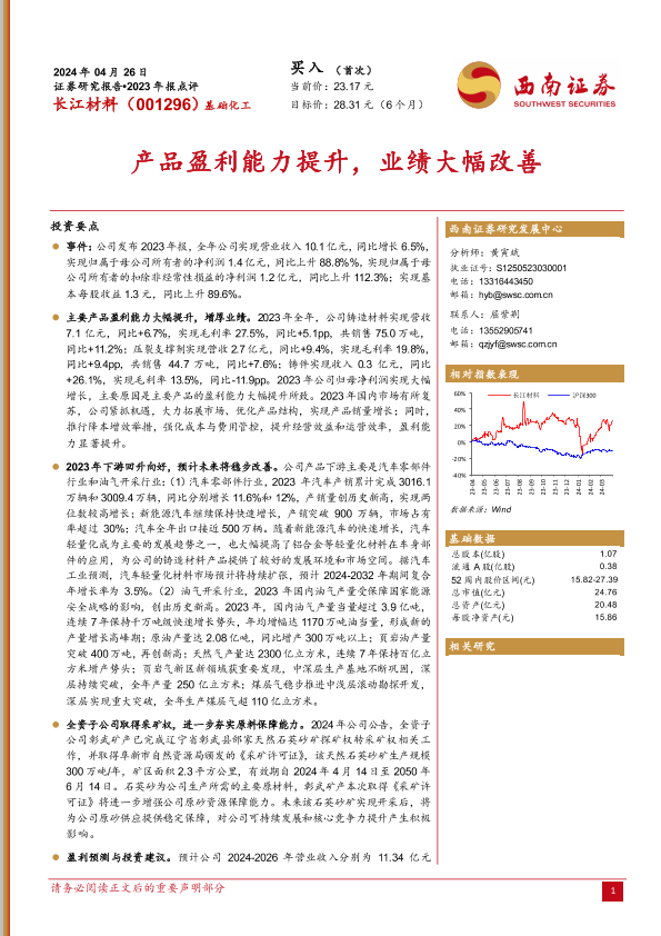 【西南证券】【20240426】长江材料-001296.SZ-产品盈利能力提升,业绩大幅改善-11页