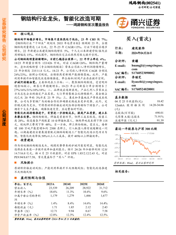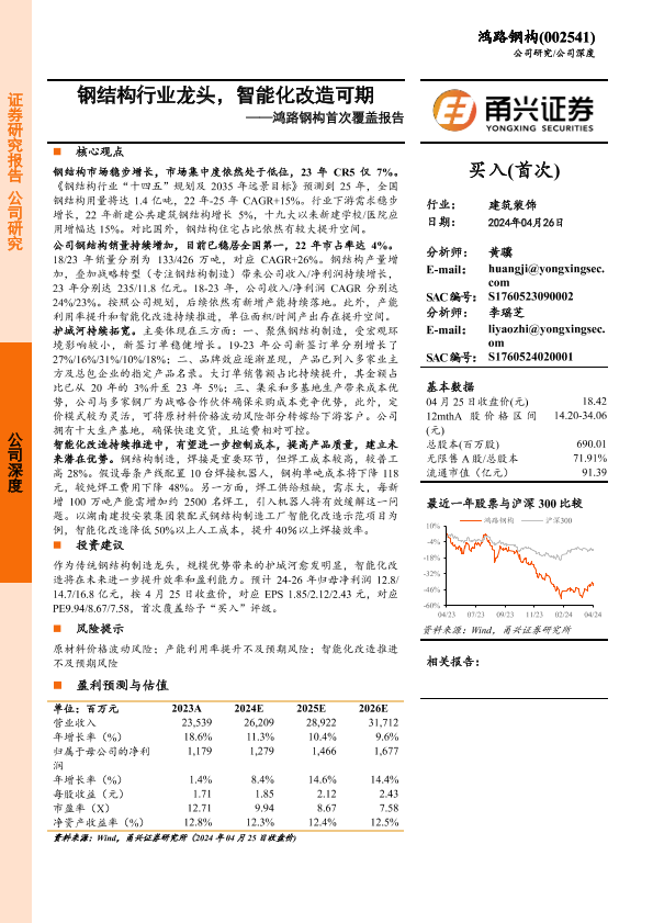 【甬兴证券】【20240426】鸿路钢构首次覆盖报告:钢结构行业龙头,智能化改造可期-24页