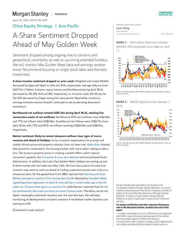 【Morgan Stanley】【20240424】中国A股市场情绪在五一黄金周前下降-9页