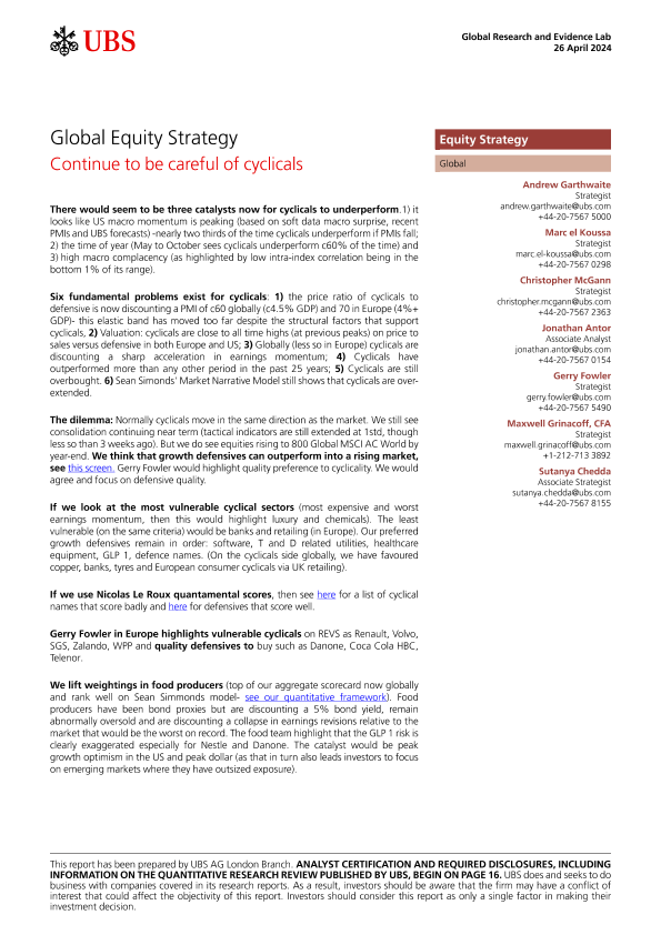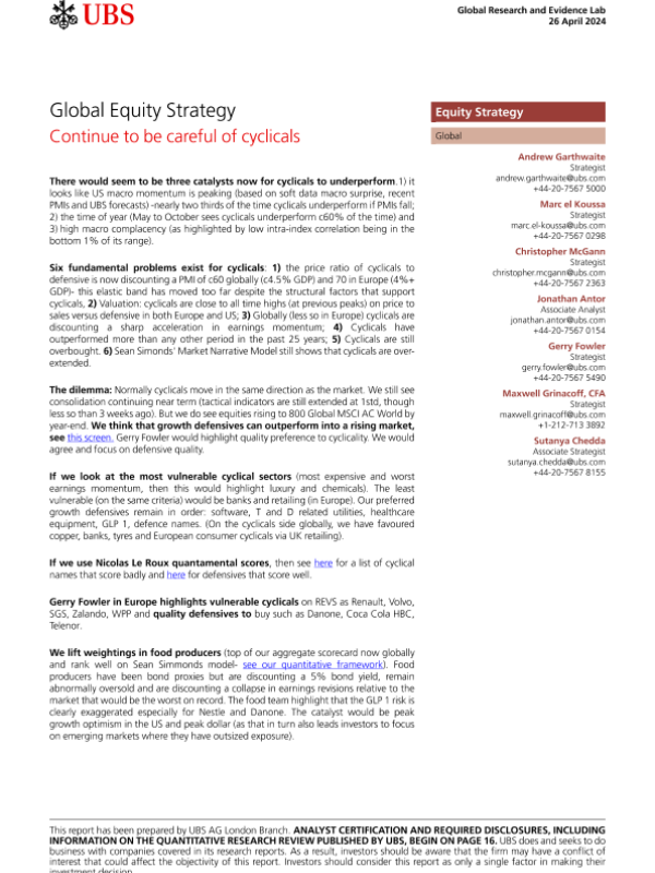 【UBS AG London Branch】【20240426】Global Equity Strategy _Continue to be careful of cyclicals-21页