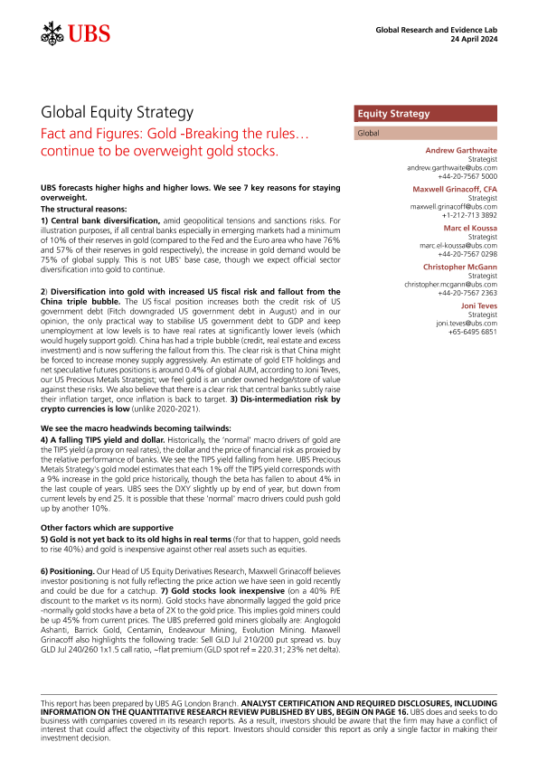 【UBS AG London Branch】【20240424】全球股票策略:事实与数据——黄金打破规则...继续超配黄金股-23页