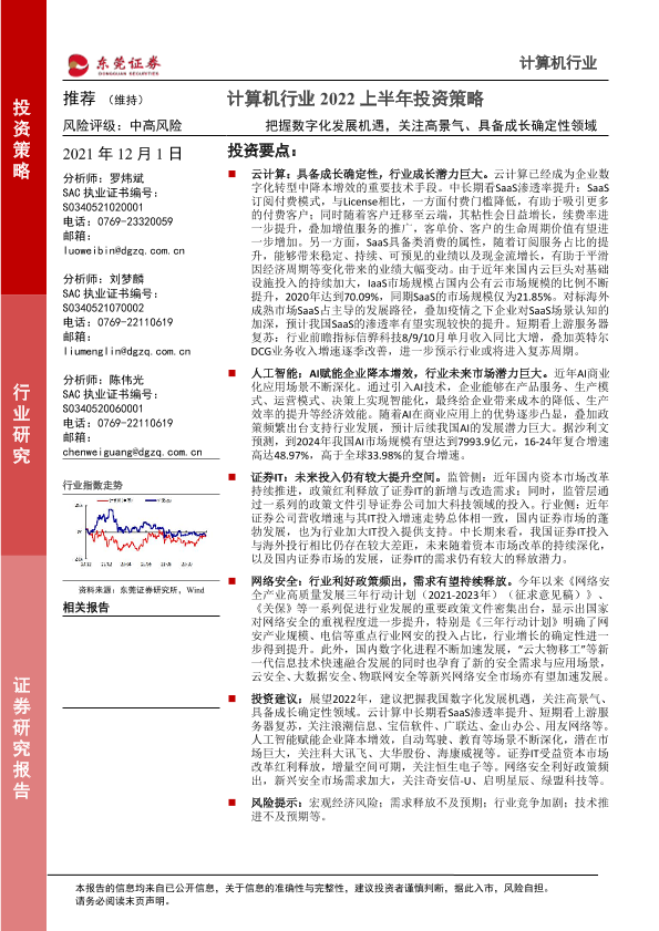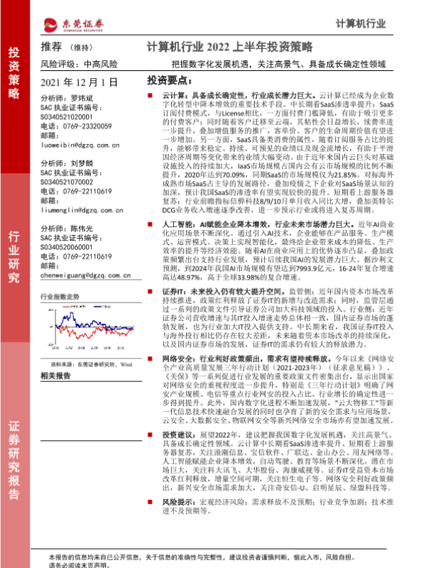 【东莞证券】【20211201】计算机行业2022上半年投资策略:把握数字化发展机遇,关注高景气、具备成长确定性领域-28页