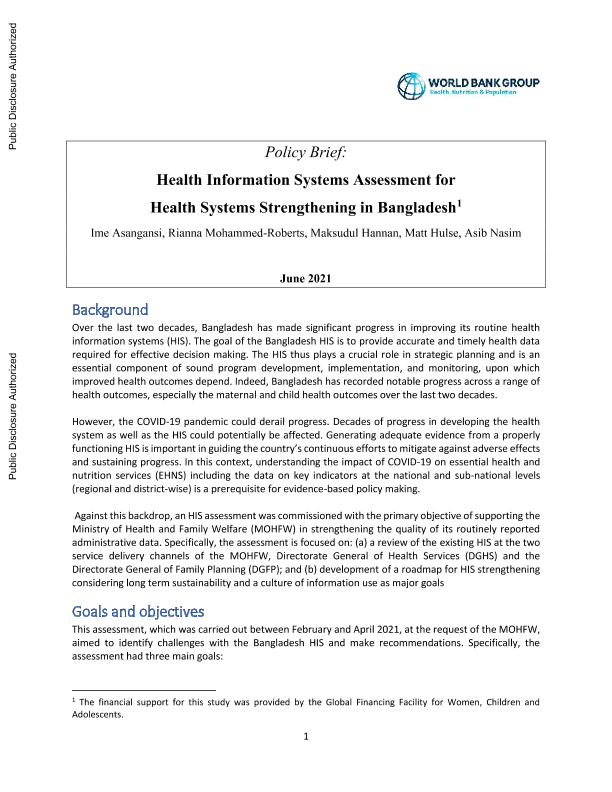 【世界银行】【202106】世界银行-孟加拉国加强卫生系统的卫生信息系统评估:政策简报-7页