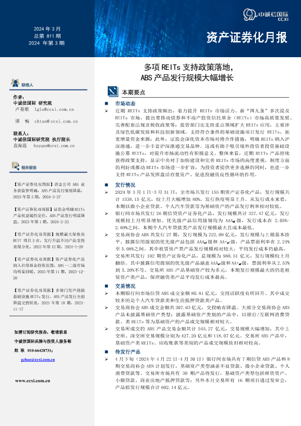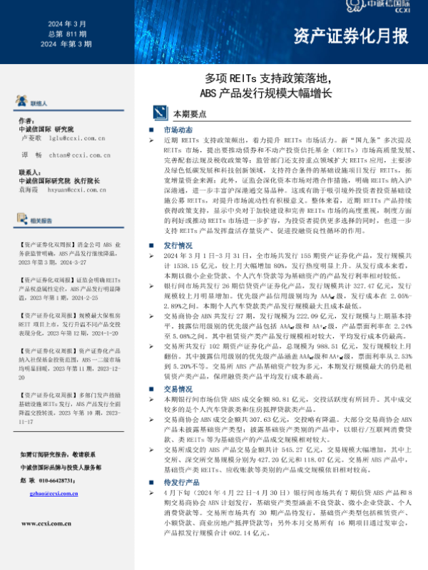 【中诚信国际】【202403】【资产证券化月报】多项REITs支持政策落地,ABS产品发行规模大幅增长-25页