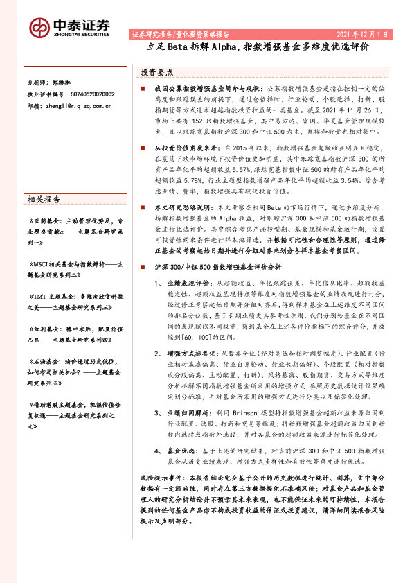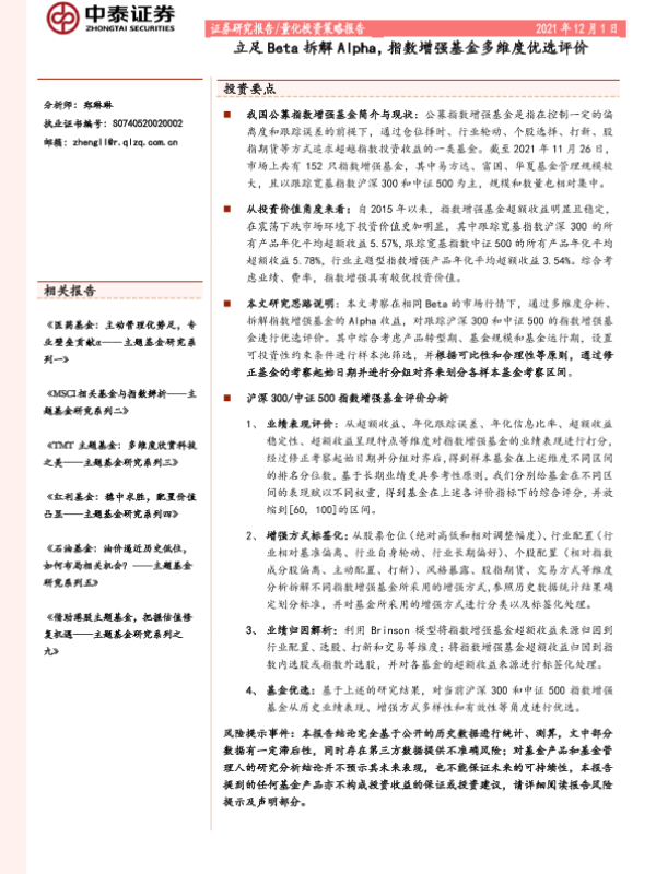 【中泰证券】【20211201】量化投资策略报告:立足Beta拆解Alpha,指数增强基金多维度优选评价-50页