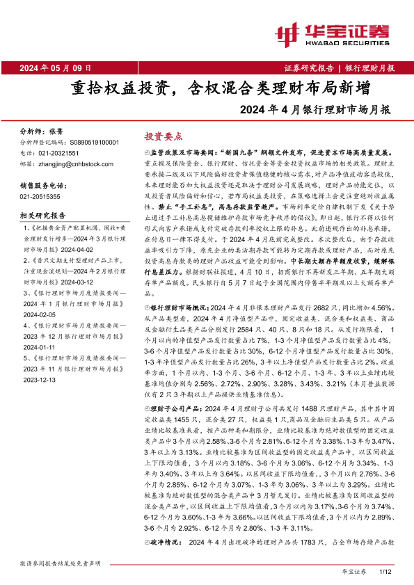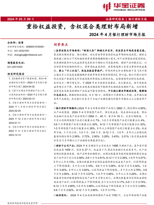 【华宝证券】【20240509】2024年4月银行理财市场月报:重拾权益投资,含权混合类理财布局新增-12页
