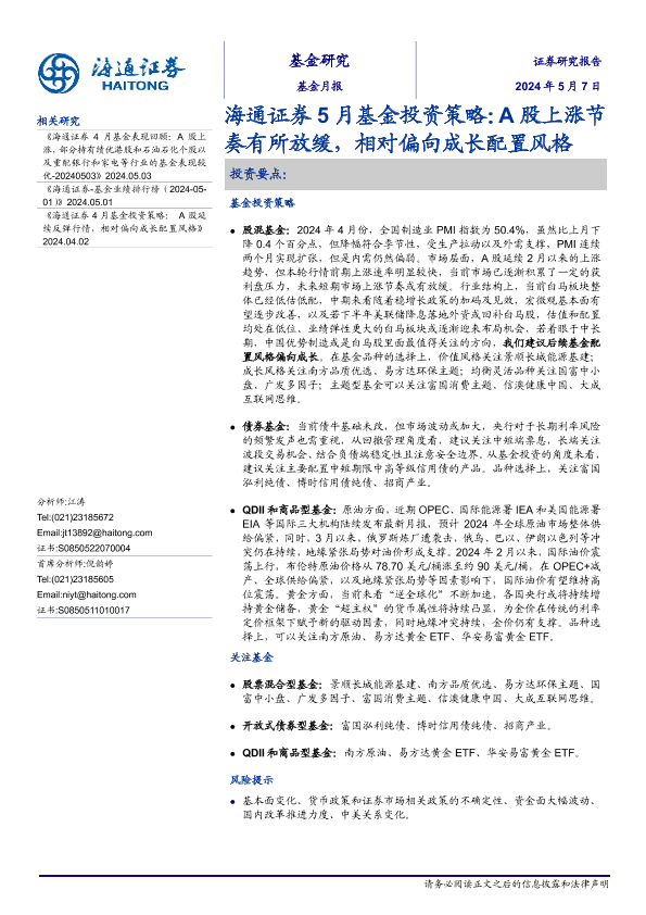 【海通证券】【20240507】5月基金投资策略:A股上涨节奏有所放缓,相对偏向成长配置风格-12页