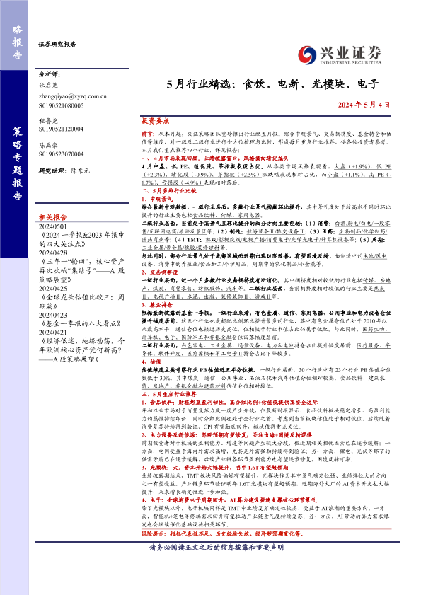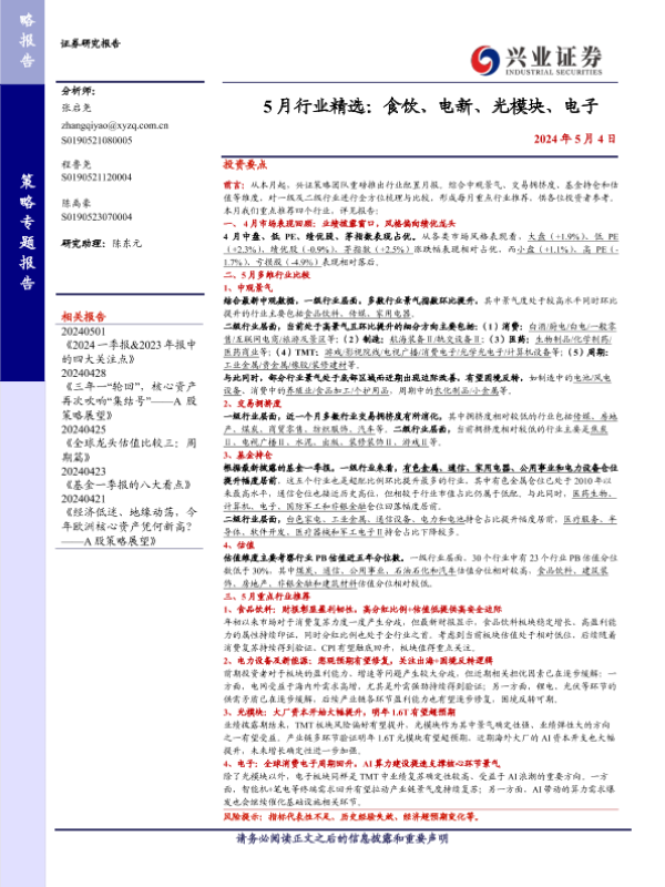 【兴业证券】【20240504】5月行业精选:食饮、电新、光模块、电子-18页