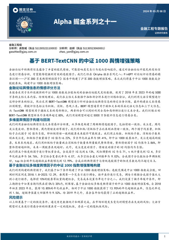 【国金证券】【20240508】Alpha掘金系列之十一:基于BERT-TextCNN的中证1000舆情增强策略-20页
