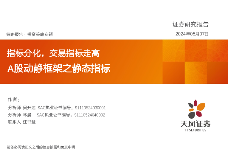 【天风证券】【20240507】A股动静框架之静态指标:指标分化,交易指标走高-17页