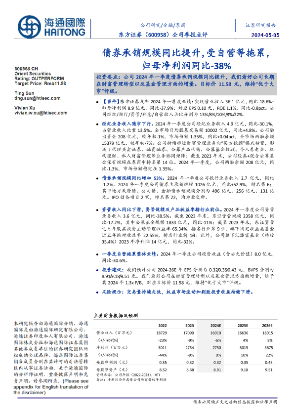【海通国际】【20240505】东方证券(600958)债券承销规模同比提升,受自营等拖累,归母净利润同比-38%-14页