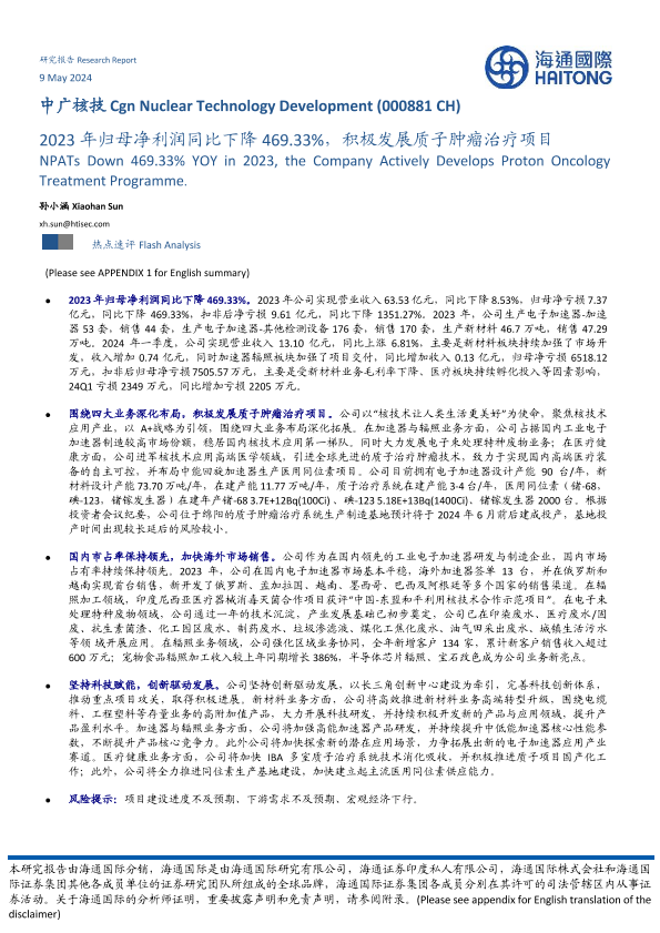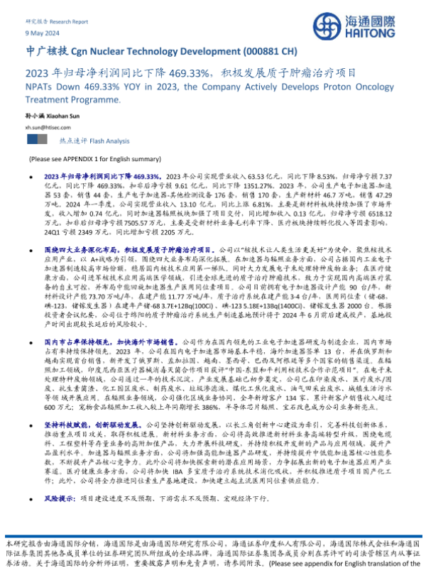 【海通国际】【20240509】中广核技2023年归母净利润同比下降469.33%,积极发展质子肿瘤治疗项目-11页