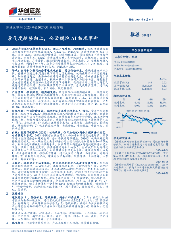 【华创证券】【20240509】传媒互联网2023年&2024Q1业绩综述:景气度趋势向上,全面拥抱AI技术革命-35页