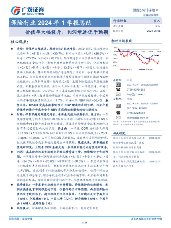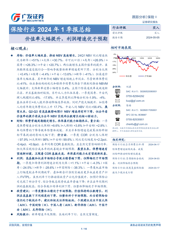 【广发证券】【20240505】保险行业2024年1季报总结:价值率大幅提升,利润增速优于预期-14页