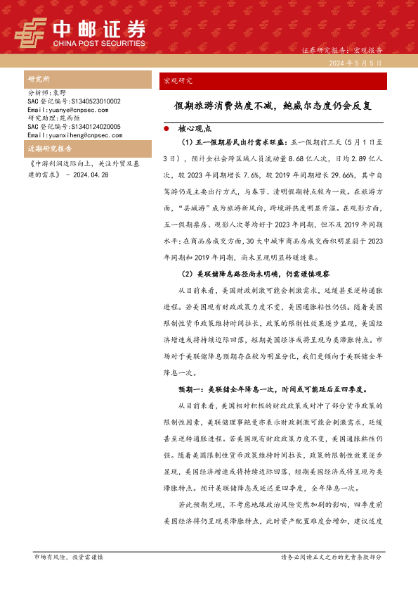 【中邮证券】【20240505】假期旅游消费热度不减,鲍威尔态度仍会反复-45页