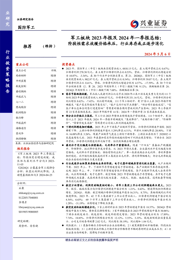 【兴业证券】【20240506】军工板块2023年报及2024年一季报总结 阶段性需求放缓价格承压,行业库存或正逐步消化-52页