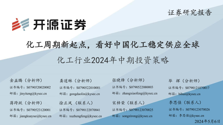 【开源证券】【20240506】化工行业2024年中期投资策略:化工周期新起点,看好中国化工稳定供应全球-42页