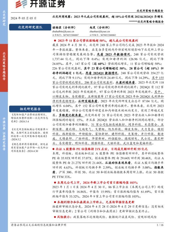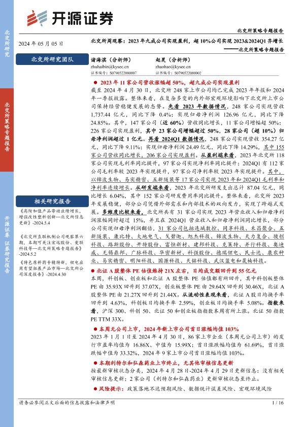 【开源证券】【20240505】北交所周观察:2023年九成公司实现盈利,超10%公司实现2023&2024Q1齐增长-16页