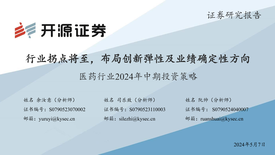 【开源证券】【20240507】医药行业2024年中期投资策略:行业拐点将至,布局创新弹性及业绩确定性方向-78页