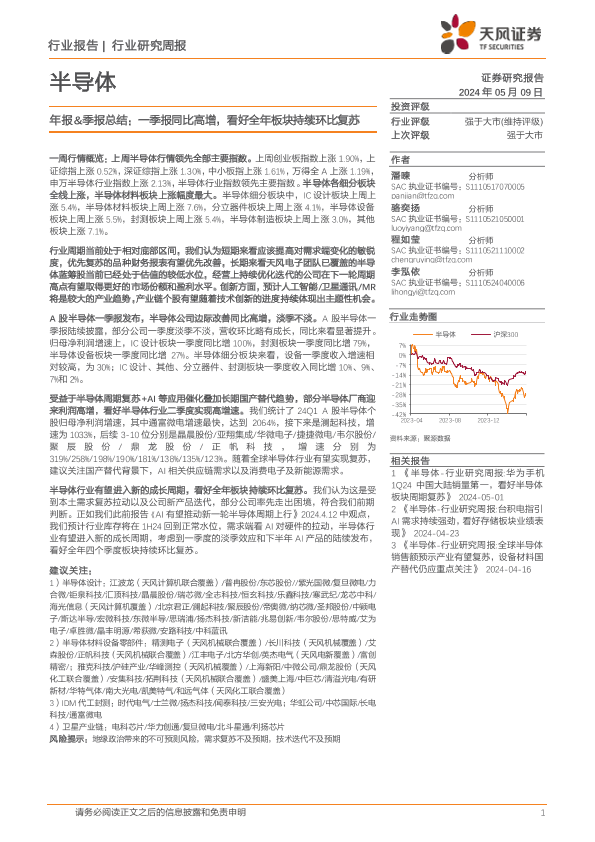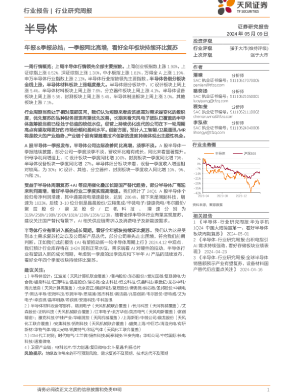 【天风证券】【20240509】半导体行业年报&季报总结:一季报同比高增,看好全年板块持续环比复苏-39页