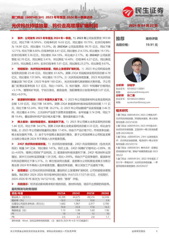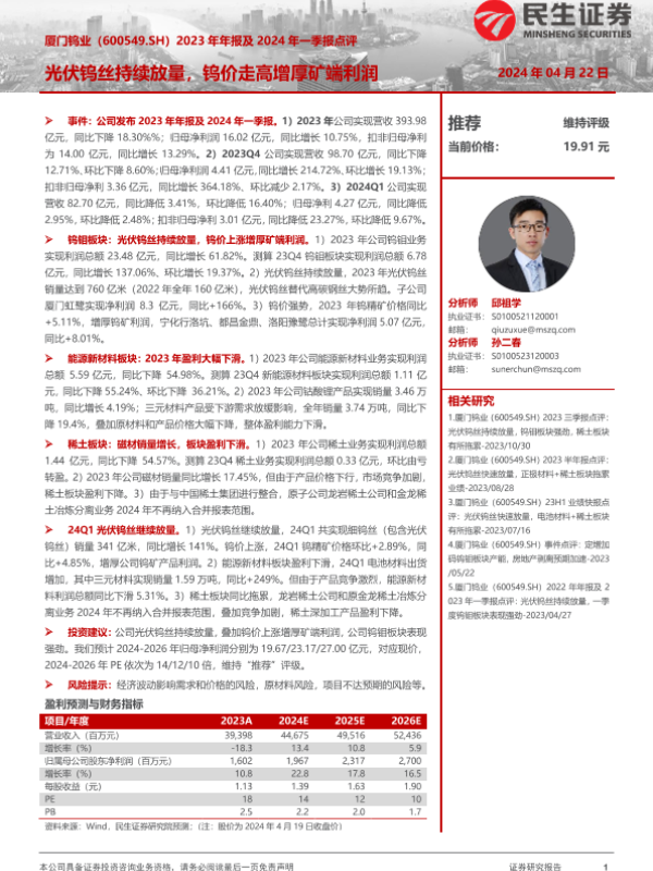 【民生证券】【20240422】厦门钨业-600549.SH-2023年年报及2024年一季报点评:光伏钨丝持续放量,钨价走高增厚矿端利润-23页