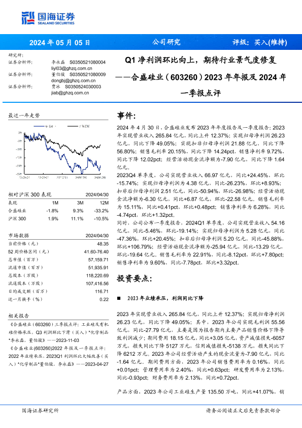 【国海证券】【20240505】合盛硅业(603260)2023年年报及2024年一季报点评:Q1净利润环比向上,期待行业景气度修复-13页