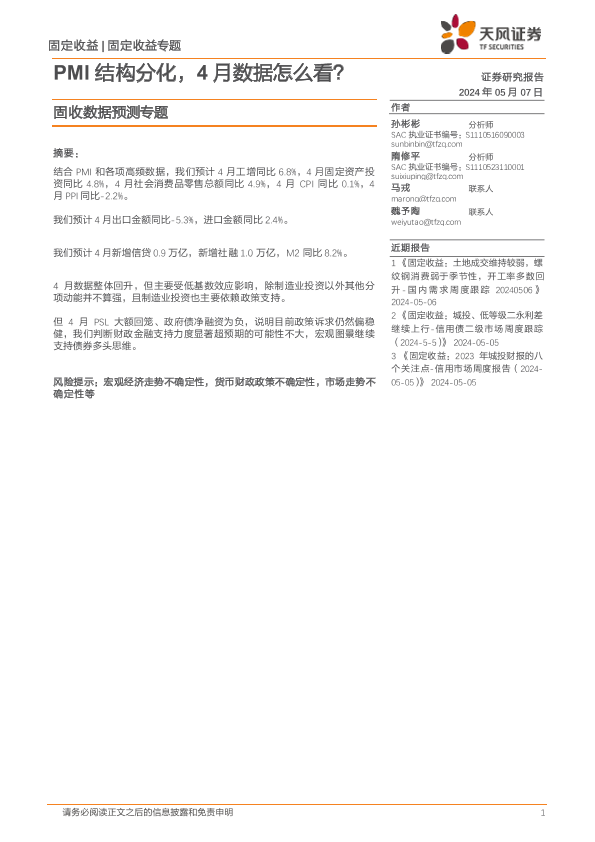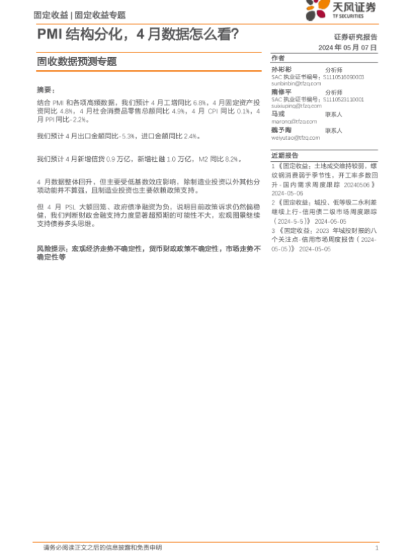 【天风证券】【20240507】固收数据预测专题:PMI结构分化,4月数据怎么看?-20页