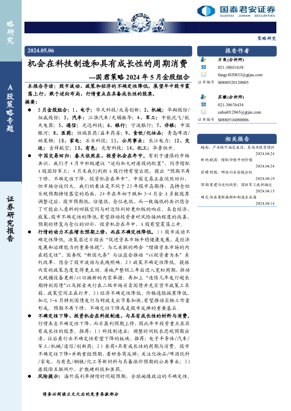 【国泰君安证券】【20240506】国君策略2024年5月金股组合:机会在科技制造和具有成长性的周期消费-31页