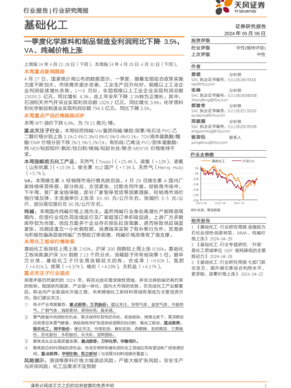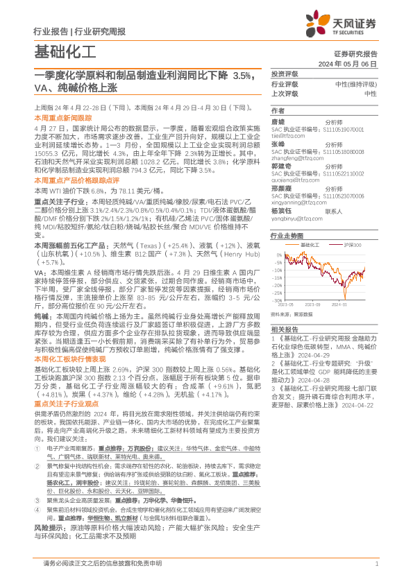 【天风证券】【20240506】基础化工行业报告:一季度化学原料和制品制造业利润同比下降3.5%,VA、纯碱价格上涨-20页