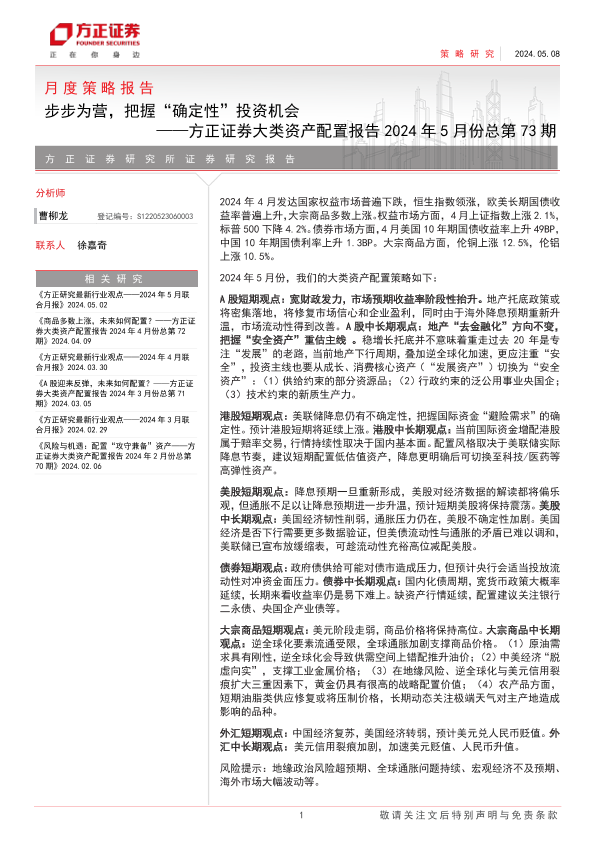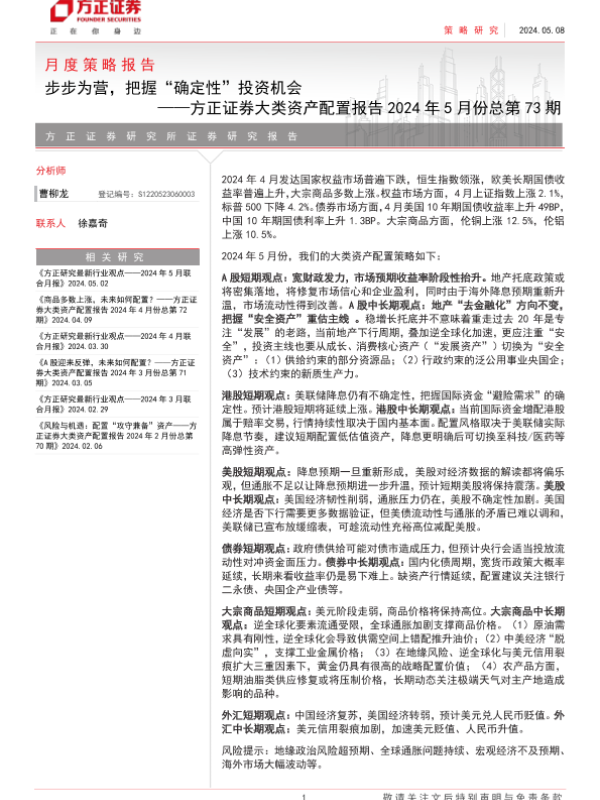【方正证券】【20240508】大类资产配置报告2024年5月份总第73期:步步为营,把握“确定性”投资机会-27页