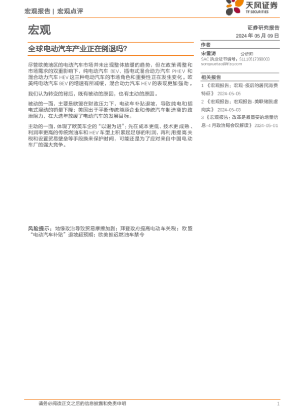 【天风证券】【20240509】宏观点评:全球电动汽车产业正在倒退吗?-12页
