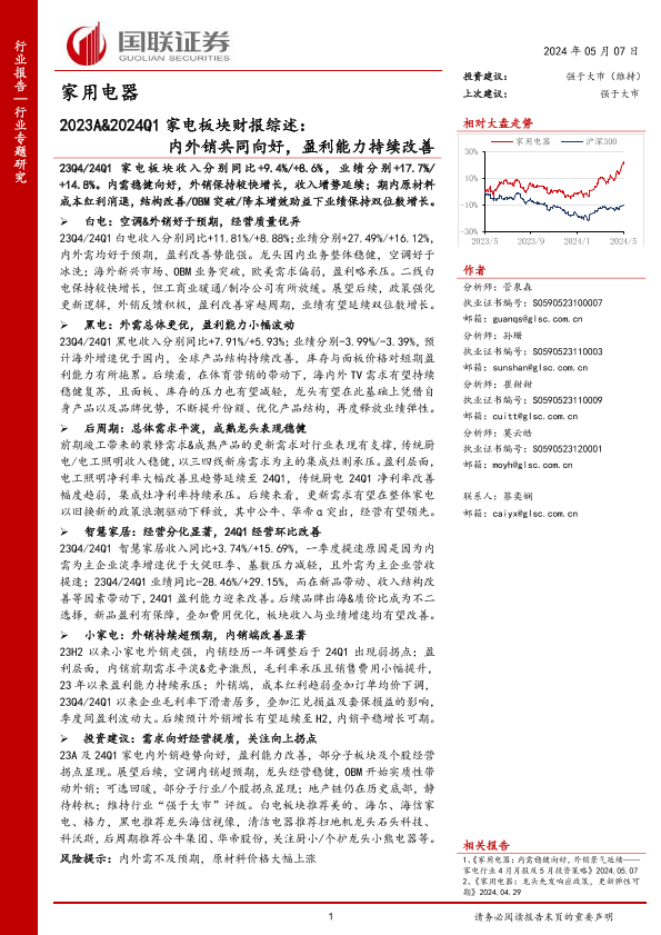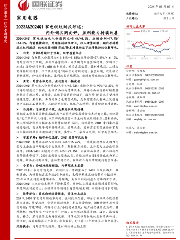 【国联证券】【20240507】家用电器行业2023A&2024Q1家电板块财报综述:内外销共同向好,盈利能力持续改善-27页