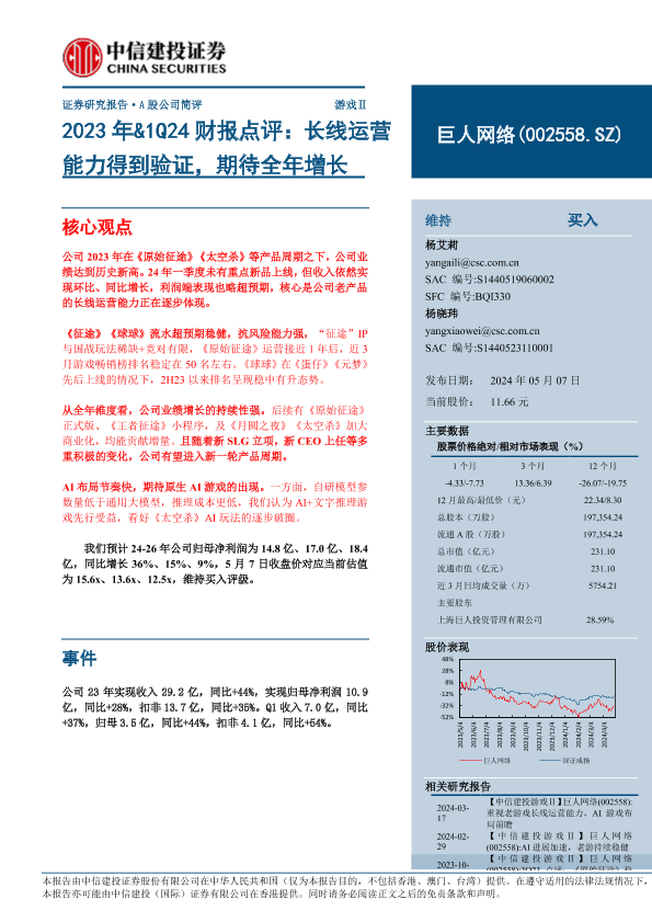 【中信建投证券】【20240507】巨人网络(002558)2023年&1Q24财报点评:长线运营能力得到验证,期待全年增长-11页