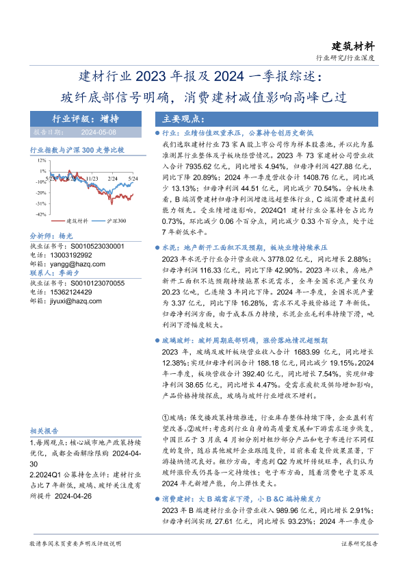 【华安证券】【20240508】建材行业2023年报及2024一季报综述:玻纤底部信号明确,消费建材减值影响高峰已过-21页