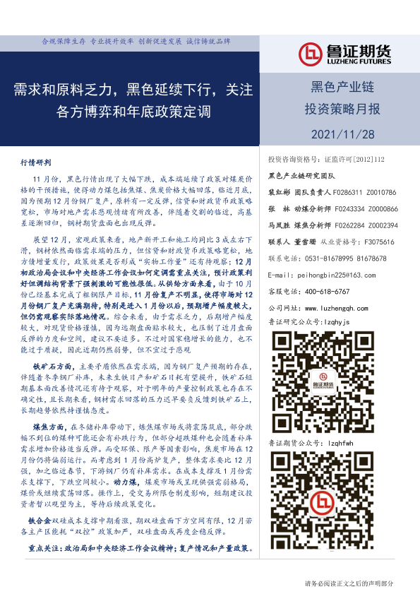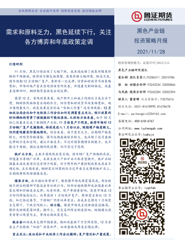【鲁证期货】【20211128】黑色产业链投资策略月报:需求和原料乏力,黑色延续下行,关注各方博弈和年底政策定调-20页