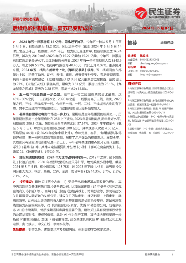 【民生证券】【20240507】影视行业动态报告:后续电影档期展望,复苏已变新成长-19页