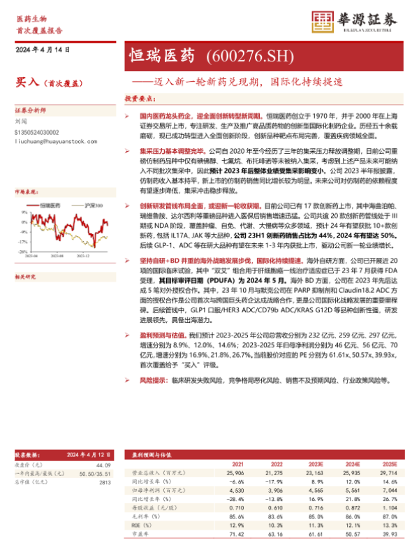 【华源证券】【20240414】恒瑞医药-迈入新一轮新药兑现期,国际化持续提速-17页