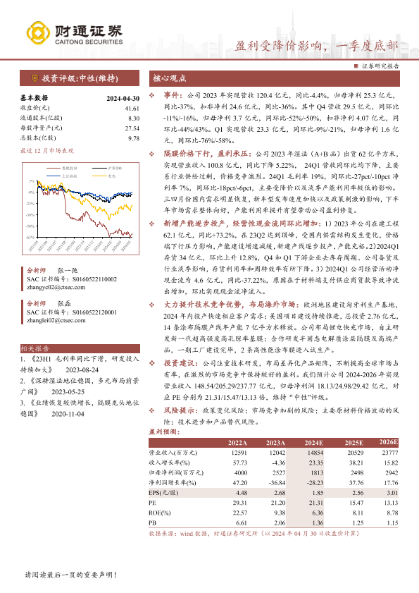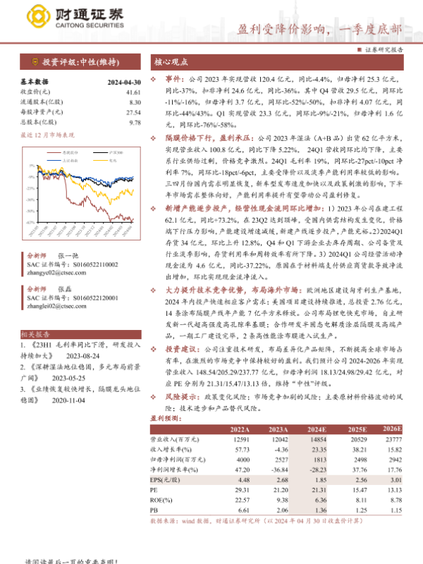 【财通证券】【20240430】恩捷股份(002812)盈利受降价影响,一季度底部-10页