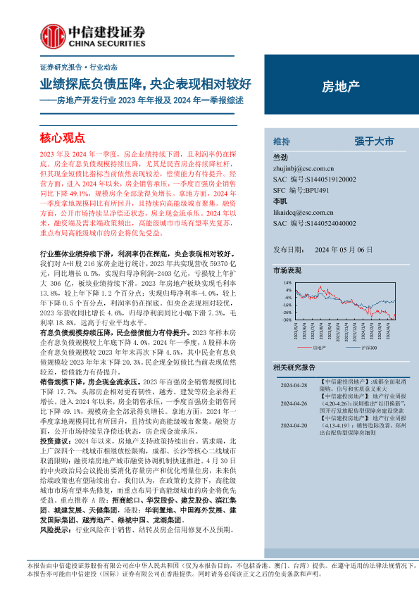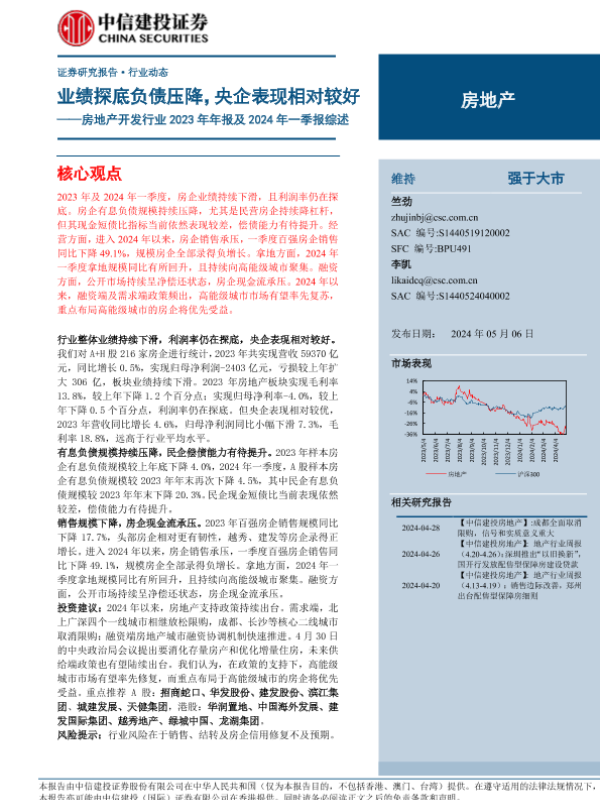 【中信建投证券】【20240506】房地产开发行业2023年年报及2024年一季报综述:业绩探底负债压降,央企表现相对较好-18页