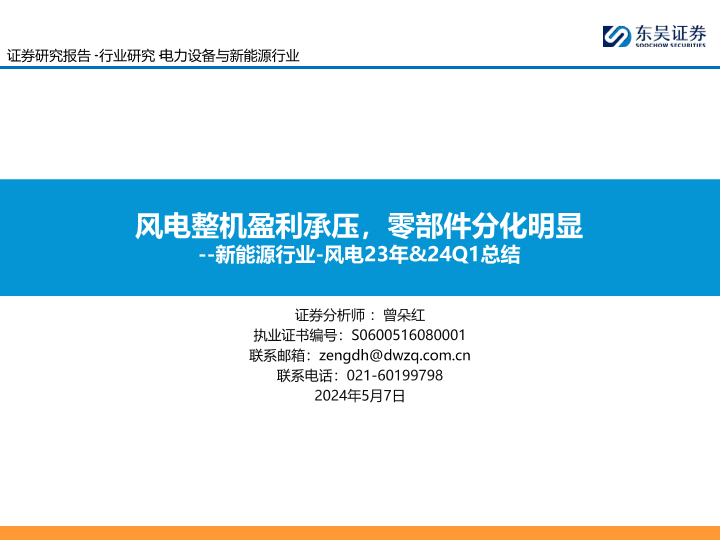 【东吴证券】【20240507】新能源行业风电23年&24Q1总结:风电整机盈利承压,零部件分化明显-36页