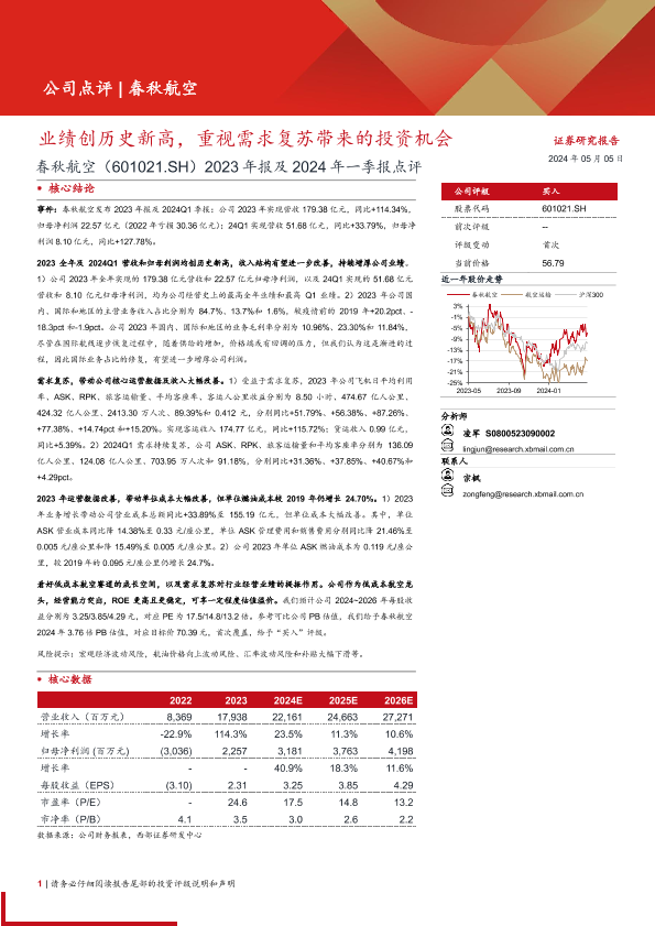 【西部证券】【20240505】春秋航空(601021)2023年报及2024年一季报点评:业绩创历史新高,重视需求复苏带来的投资机会-17页