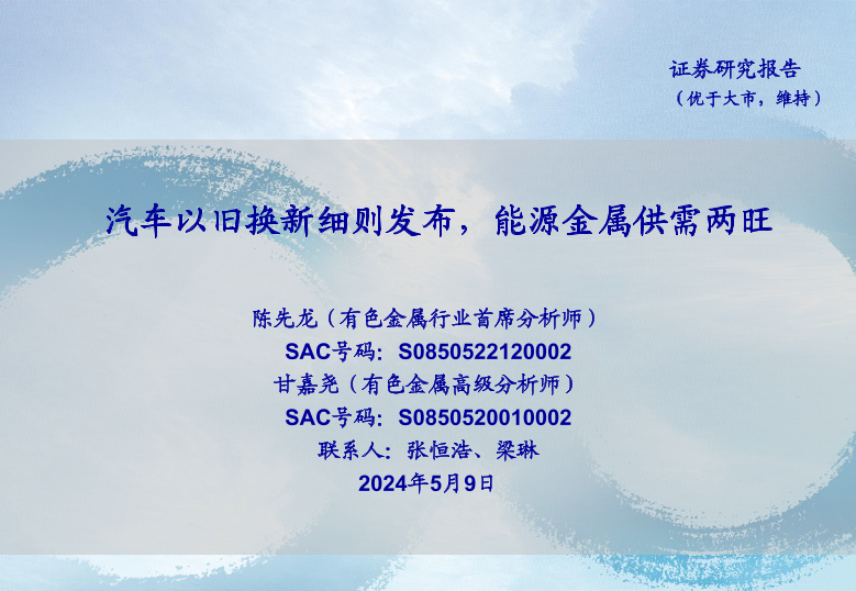 【海通证券】【20240509】有色金属行业:汽车以旧换新细则发布,能源金属供需两旺-25页