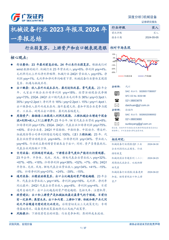【广发证券】【20240505】机械设备行业2023年报及2024年一季报总结:行业弱复苏,上游资产和出口链表现亮眼-37页