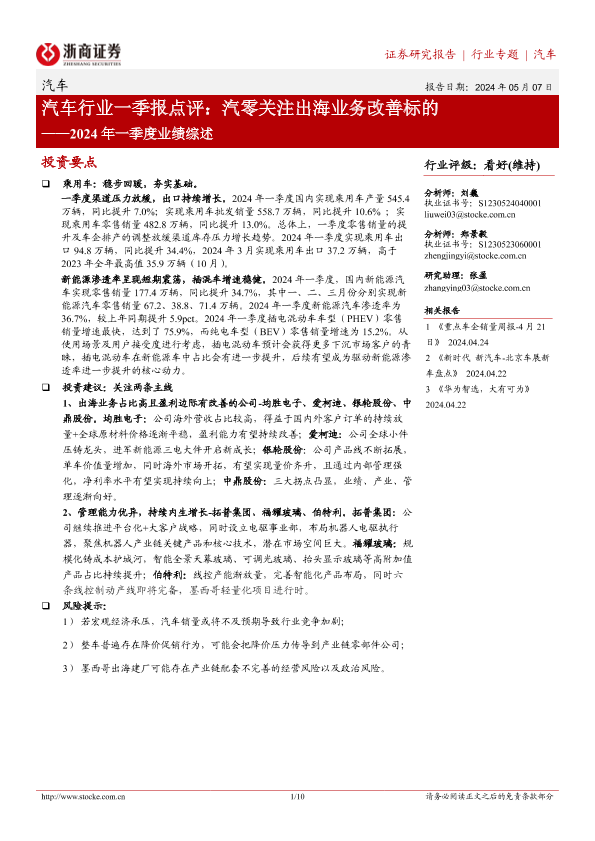 【浙商证券】【20240507】汽车行业2024年一季度业绩综述-汽车行业一季报点评:汽零关注出海业务改善标的-10页