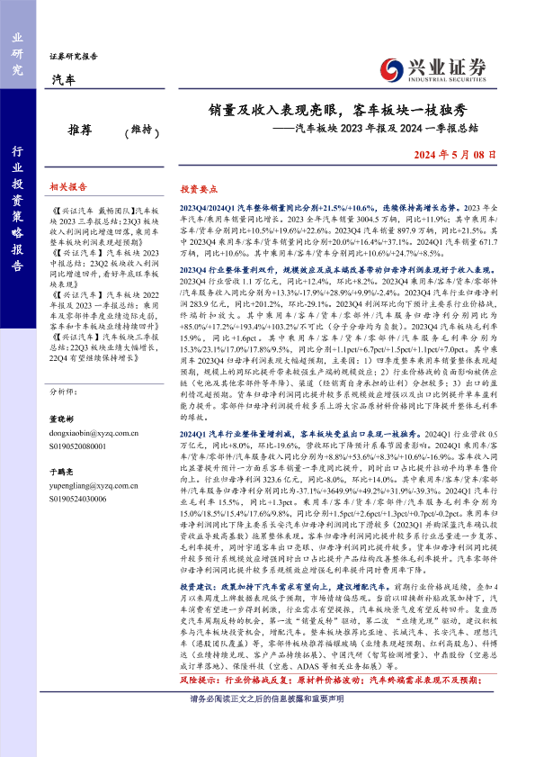 【兴业证券】【20240508】汽车行业板块2023年报及2024一季报总结:销量及收入表现亮眼,客车板块一枝独秀-17页