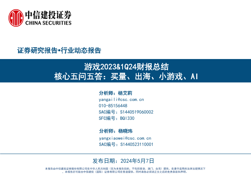【中信建投证券】【20240507】游戏行业2023&1Q24财报总结-核心五问五答:买量、出海、小游戏、AI-42页