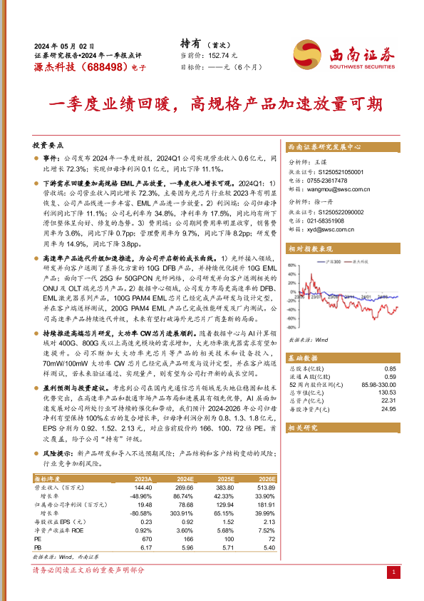 【西南证券】【20240502】源杰科技(688498)2024年一季报点评:一季度业绩回暖,高规格产品加速放量可期-10页