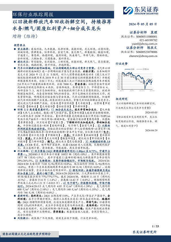 【东吴证券】【20240505】环保行业跟踪周报:以旧换新释放汽车回收拆解空间,持续推荐水务/燃气/固废红利资产+细分成长龙头-33页