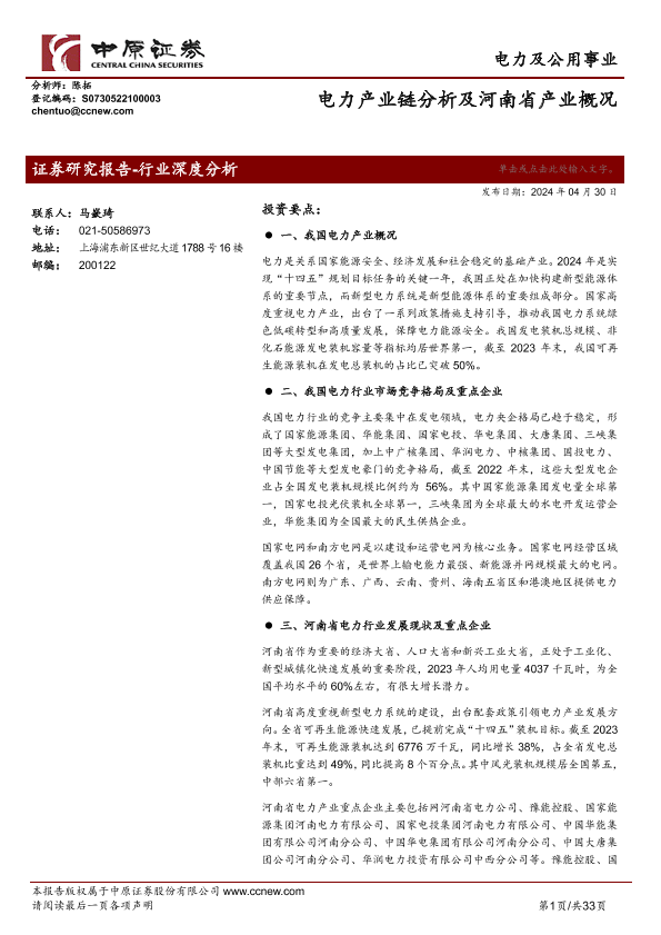 【中原证券】【20240430】电力及公用事业行业:电力产业链分析及河南省产业概况-33页