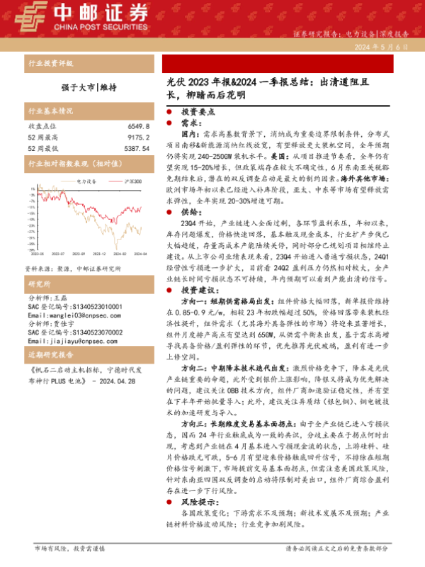 【中邮证券】【20240506】电力设备行业光伏2023年报&2024一季报总结:出清道阻且长,柳暗而后花明-23页